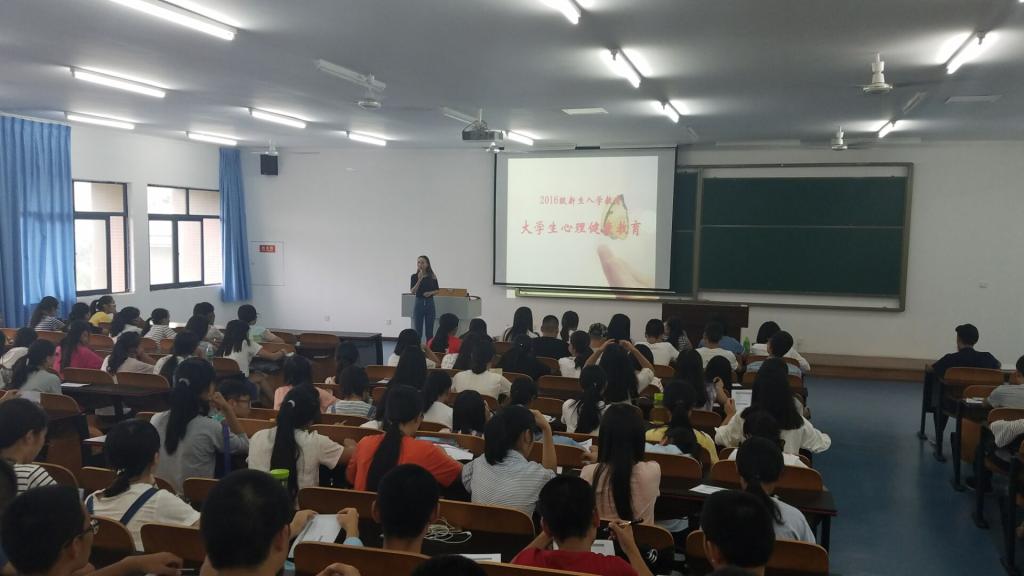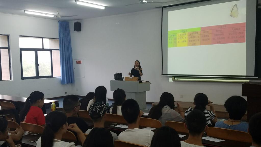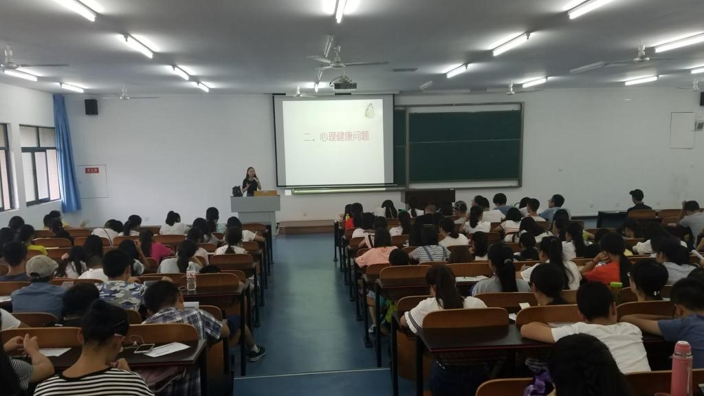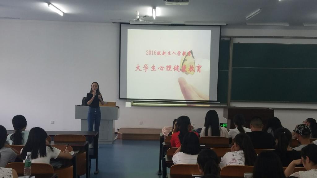 心理专员罗姝老师担任本次讲座主讲人,全体2016级新生到场聆听。