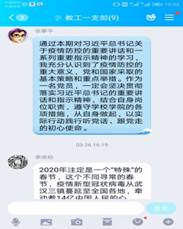 1、2月和3月,学院教工党支部积极开展线上组织生活,通过导背景、导结构、导重点、导内容、导思想的“五导”学习模式,组织广大教职工利用QQ等在线平台自学相关学习文件、分享学习心得体会、结合自身专业背景开展深入讨论。如行政支部在3月底“坚定理想信念、永葆政治本色”的主题当日活动中,黄浩、邱旭两位同志作为本次导学党员,向支部全体党员分享了疫情防控中的先进人物先进事迹,通过对先进人物事迹的学习,引导党员们深入思考本次主题教育的本质。