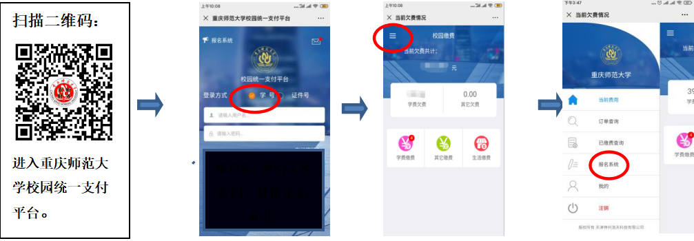 校内考生扫描二维码用学号登录报名系统,选择报名项目后即可报名缴费;校外考生扫描二维码进入报名系统,选择报名项目后需先注册后再报名缴费。
