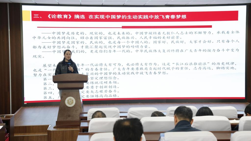 会议最后,钟敏书记带领全体教职工进行政治思想领学,代表学院党委提出要求,希望全体教师切实加强理论学习,原原本本学、认认真真悟,深刻领会学习材料的时代背景、科学体系、精神实质,深刻领会政治意义、理论意义、实践意义,增强投身教育强国和现代化新重庆建设的社会责任感和使命感,把学院的发展、个人事业的发展放到教育强国、教育强市的大背景中去思考、谋划和考量,彰显经管担当、体现经管作为、做出经管贡献。