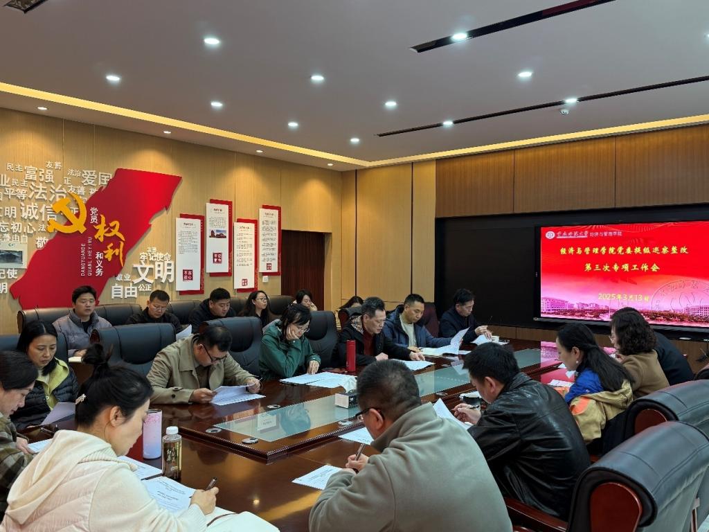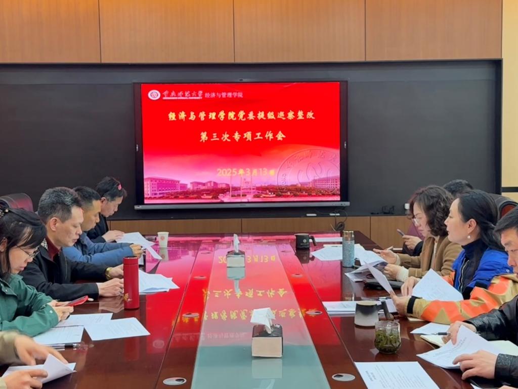 2025年3月13日下午,学院党委巡察整改工作组在求是楼420会议室召开第三次专项工作会议,党委书记钟敏主持,工作组全体成员参会,学院党委巡察整改落实监督组成员列席会议。