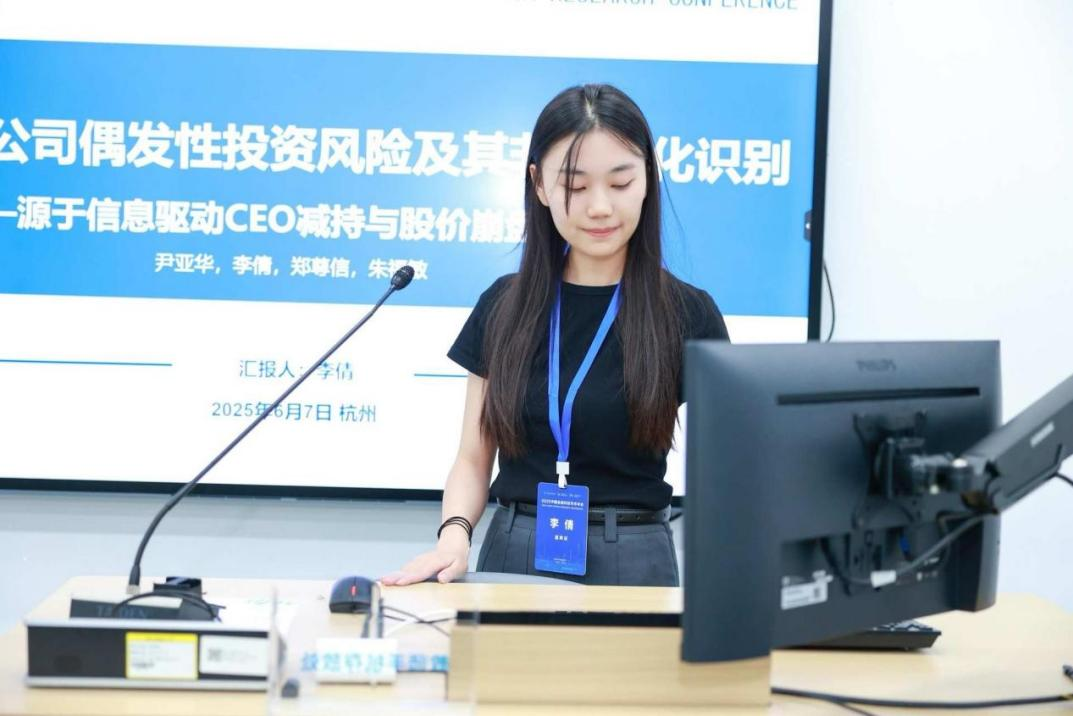 首届金融硕士研究生李倩同学(2024级)携合作论文《中国科技公司极端性投资风险及其非结构化识别——源于信息驱动CEO减持与股价崩盘的视角》应邀参会,并在“违约、流动性与崩盘风险”分论坛上作主旨报告。