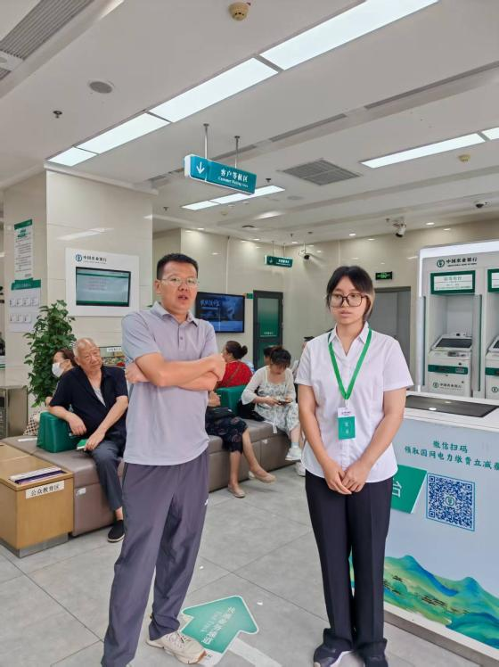 财务金融系张保帅、周玉琴两位老师来到中国农业银行沙坪坝小龙坎支行,看望正在大堂实习的2022级金融工程系学生罗燕奉,并开展现场教学指导。