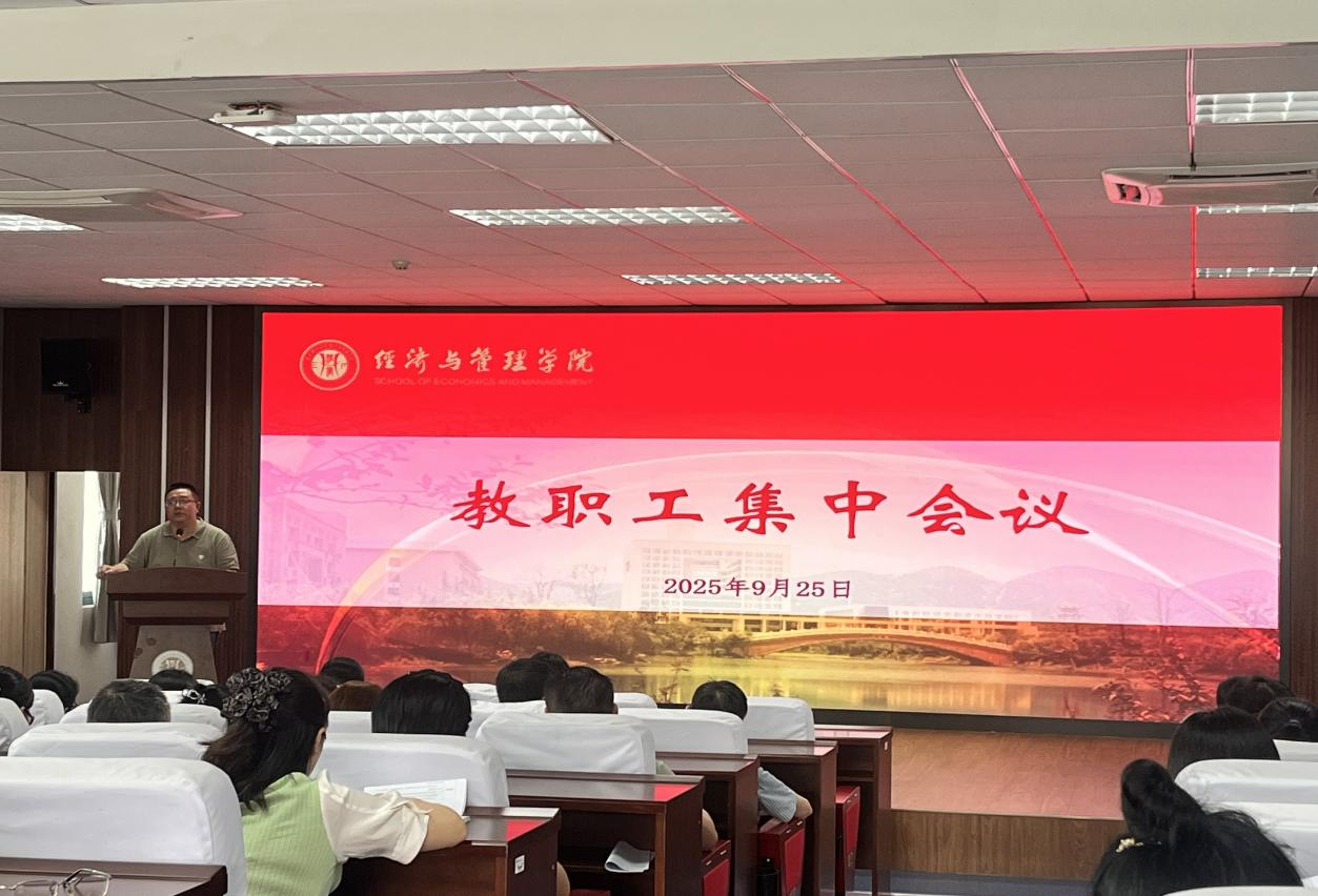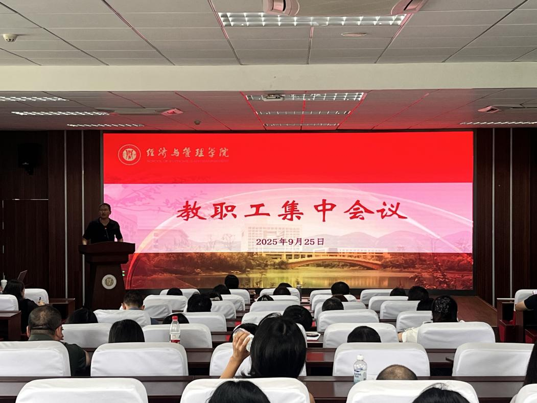 在求是楼517会议室召开全体教职工大会。学院党委书记钟敏、执行院长郑景丽、党委副书记李青松,副院长陈宇科、副院长段俊及全体教职工参加会议。