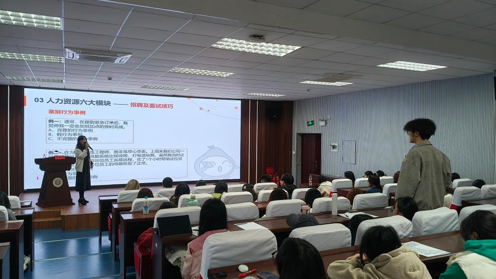 讲座中,张燕霞还重点讲解了招聘与面试的关键技巧。基于多年从业经验,她深入介绍了行为面试法的应用,通过“完整的行为实例”与“假行为事例”“不完整的行为事例”等正反案例,帮助学生识别面试中的常见误区,提升职场准备度。她还特别强调了STAR面试法的重要性,建议有志从事人力资源工作的同学熟练掌握这一专业工具,持续提升面试技巧与专业素养。