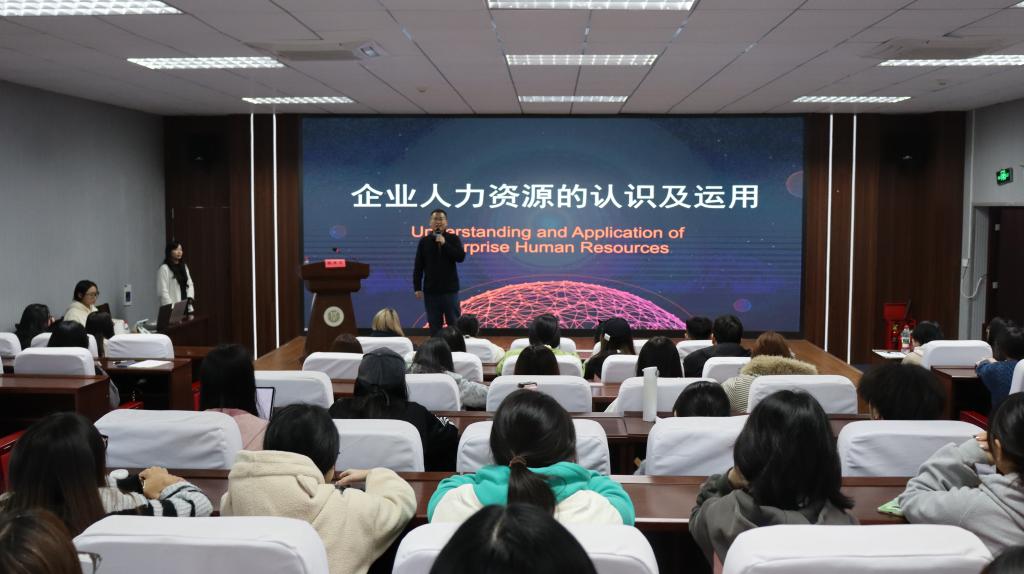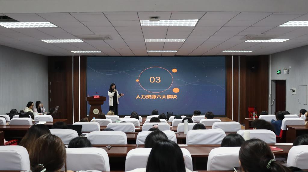 张燕霞系统阐述了人力资源发展历程与职场实践应用。她将分享内容清晰分为企业人力资源发展史、HR职业角色扮演、人力资源六大模块,以及人力三支柱模式四个板块,通过生动的案例分析,结合互动提问,引导学生积极参与和主动思考,现场气氛活跃。讲座有助于学生构建系统的人力资源知识体系。