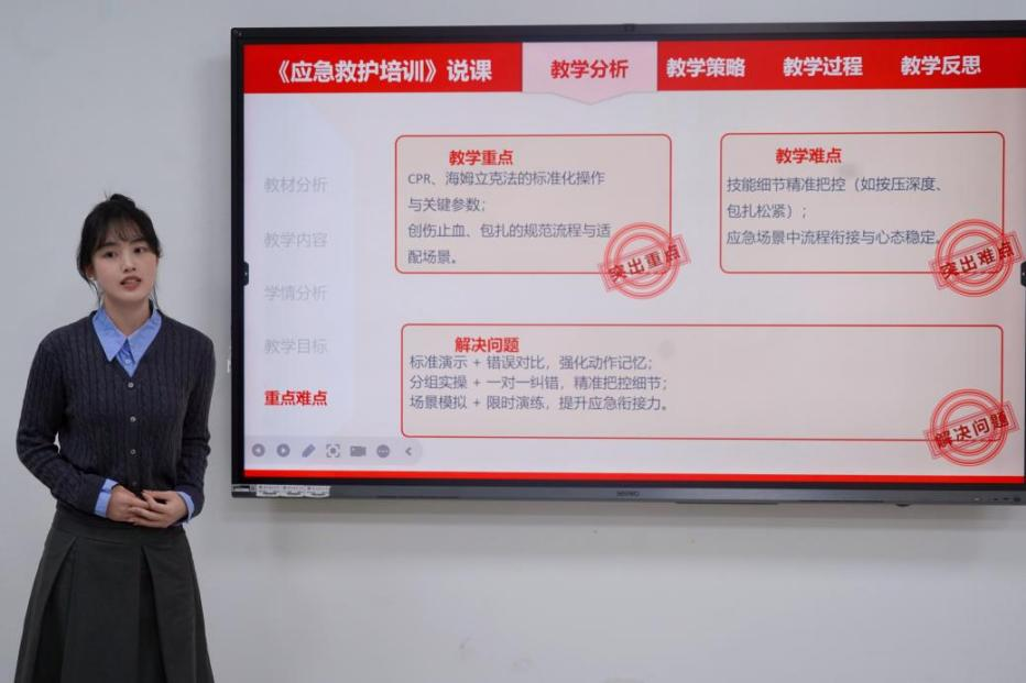 何清老师则对比赛整体质量给予肯定,她表示本次选手选课丰富多元,既有以“学急救·能考证·会施救”为主题、内容实用且课件精美的讲授,也有讲课脉络清晰、融入个人思考的选手,还有选手会结合自身实践经验分享直播带货实操案例。同时,她建议部分选手需在教案设计上下功夫,合理运用图表等可视化工具增强逻辑性,并适当控制PPT文字量、优化颜色搭配。