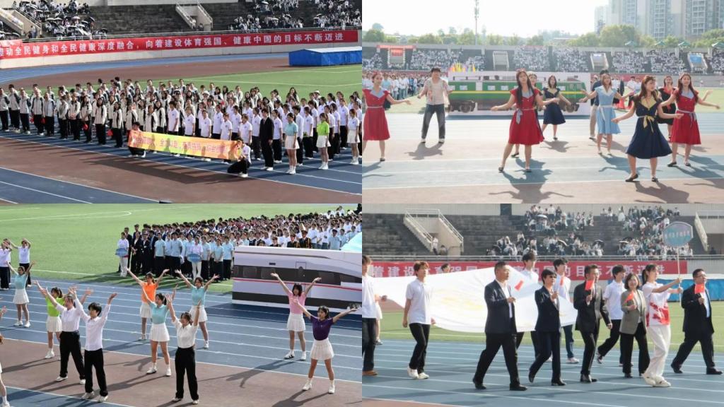 方阵步伐整齐、口号嘹亮。表演方队以“绿皮火车”到“高铁”的时代变迁为创意,融合专业特色与艺术表现,展现了asmr18