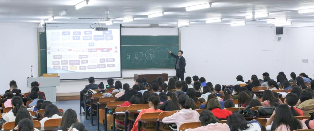 讲座伊始,任老师通过PPT展示一系列关于“大学”的关键词,让同学们自己思考已经度过的一个月大学生活,跟自己预期的大学生活有何差别。接着,任老师就学院就业形势状况阐明了学识与能力建设对于以后就业的重要性,并通过催眠游戏让同学们放松身心,想象出未来的自己以及想要的生活。随后,任老师告诉同学们该如何拥有相对稳定的关系圈,并告诉同学们要学会倾听与倾诉以缓解压力,悦纳自己。最后,任老师特别强调了安全意识的重要性,防骗防盗,告诉学生禁止参加未经学校认可的活动社团。