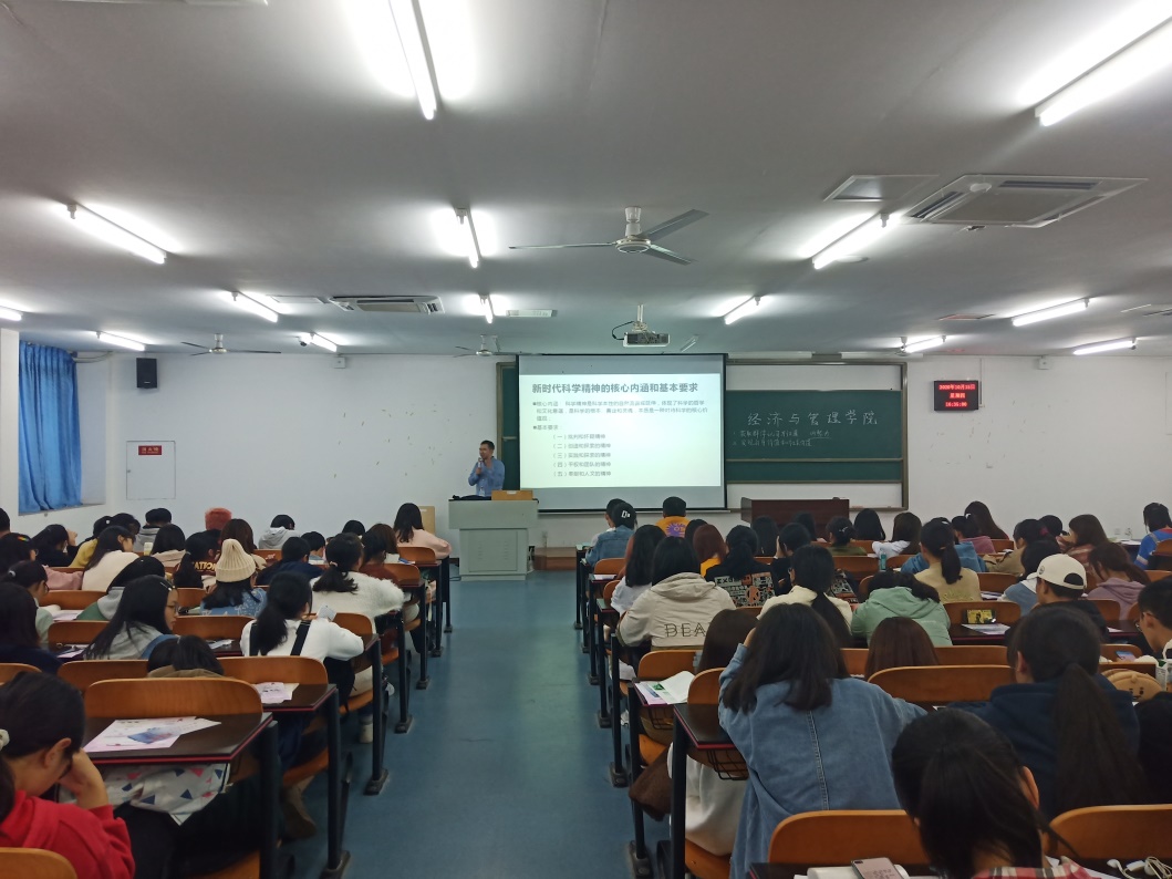 最后,结合现实以及学生当下和未来的学习发展状况,王教授提出了批判和怀疑、创造和探索、实践和探究、平权和团队、奉献和人文五大核心精神,并从多个方面进行了详尽的讲解和阐述。王教授指出,当代的大学生应该不断学习、不断探索,夯实自身基础,以科学精神为引领,不断磨砺自身、发展自我,以充盈的姿态迎接未来的机遇和挑战,为经管学院添砖加瓦,为祖国美好的明天贡献力量!