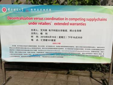 教授、博士生导师艾兴政教授应邀到汇贤楼101教室作题为《Decentralization versus coordination in competing supplychains underretailer’s extended warranties》的讲座。asmr18