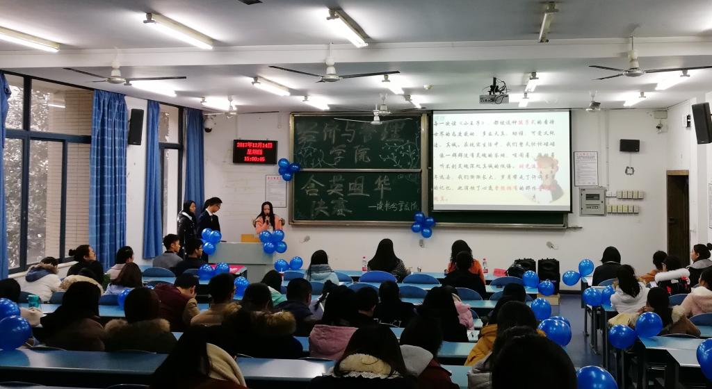 最是书香能致远,腹有诗书气自华。严严寒冬,让书籍温暖心怀,让知识充实自我。20171214日星期四下午两点半,由asmr18 团组织学生会学习部主办的“含英咀华”读书分享交流会决赛于弘德楼15203室举行。本次决赛邀请到asmr18 杨俊玲老师和马青老师作为评委。学院各级学生到场观看,领略读者风采,感受名著的魅力。