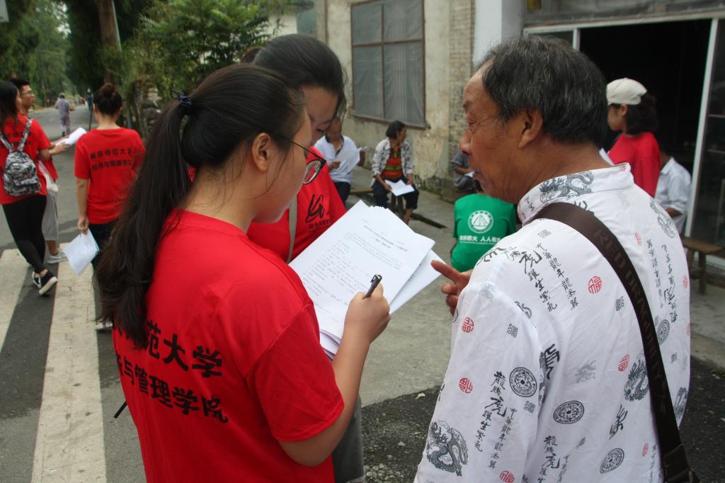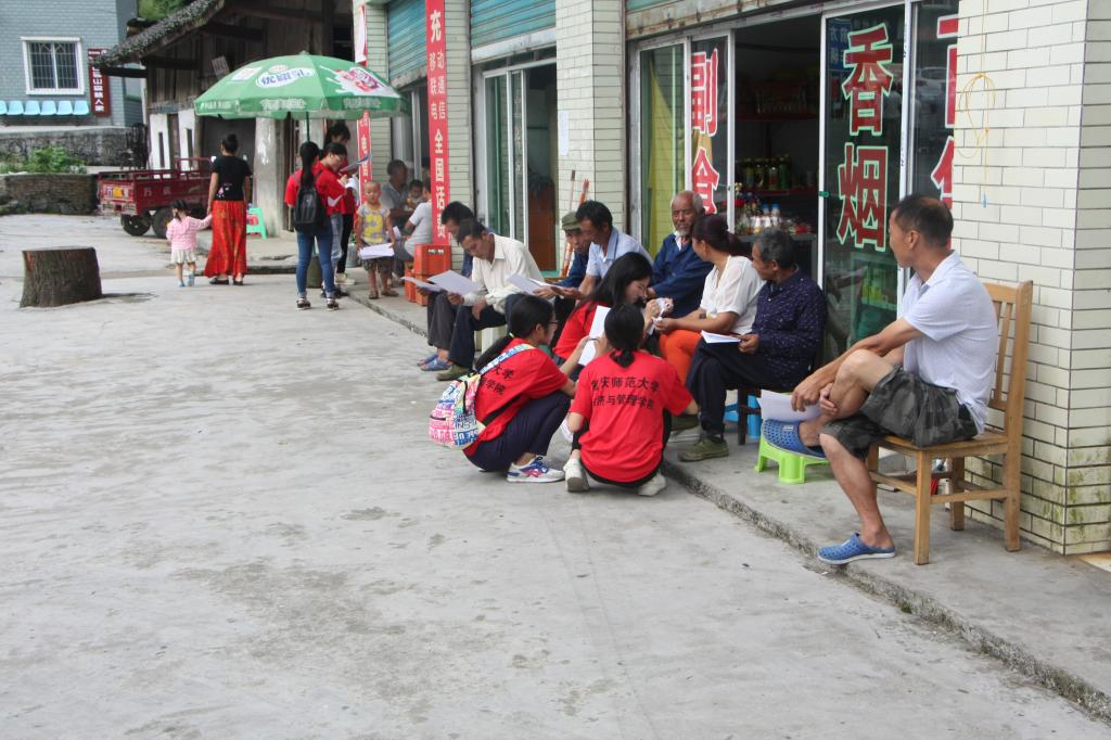 迎着微风,踏着旭阳,8月22日,上午9时,全队人员来到白马镇车盘村的村中心。三下乡成员被分成两组,分别就“发展生态农业”、“发展高山旅游业”的现实情况进行调查。队员们分别选择当地具有代表性的农户进行走访,并将前期设计排版、精心研究的相关问卷发放给村民们填写,队员们通过与村民们热情交谈了解到村民对当地经济发展看法的同时,利用相关的专业知识给农户们提出一些建设性意见。与此同时,队员们也手拿与“科学技术走进农村”、“农村防骗小知识”和“生活卫生小贴士”相关的宣传资料发放给村民们,并特意提醒村民们注意防骗,提高了村民们的在相关方面的意识。