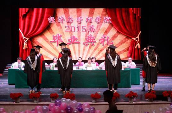 颁奖结束后由学院学位分委员会主席田盈教授、胡兵教授、邹燕教授和刘永春副教授共同为本科毕业生进行了授位拨穗仪式。老师们将毕业生们的帽穗由右边拨到左边,向毕业生们致以祝贺和勉励,并与他们握手。拨穗仪式寓意麦穗已经成熟,象征着经管学院的毕业生们已经学有所成,可以展翅高飞。拨穗仪式上的毕业生们,脸上既有对母校的依依不舍,又有学成之后的成熟稳重,但更多的是踌躇满志、青春飞扬的蓬勃朝气。