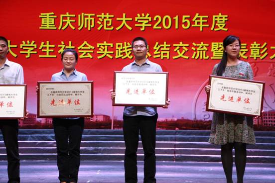 2015年的暑假,有这样一群人,他们依托于各个不同的团队,以中国人民抗日战争暨世界反法西斯战争胜利70周年为契机,积极响应中国梦的主题,实现“为祖国勤学修德、以实践明辨笃实”的目标深入社区、乡镇、农村,广泛开展了主题教育系列活动,将重庆师大的旗帜遍插四十余个区县,将重师精神与实践精神完美的结合在了一起。1022日下午,为了表彰他们的实践精神,我校在校友会堂演出厅隆重举行了暑期大学生实践总结交流暨表彰大会。校党委组织部副部长李晓燕老师、学生处副处长唐家祥老师、招生就业处副处长杨云老师、校团委副书记高菁励老师出席了此次典礼。
