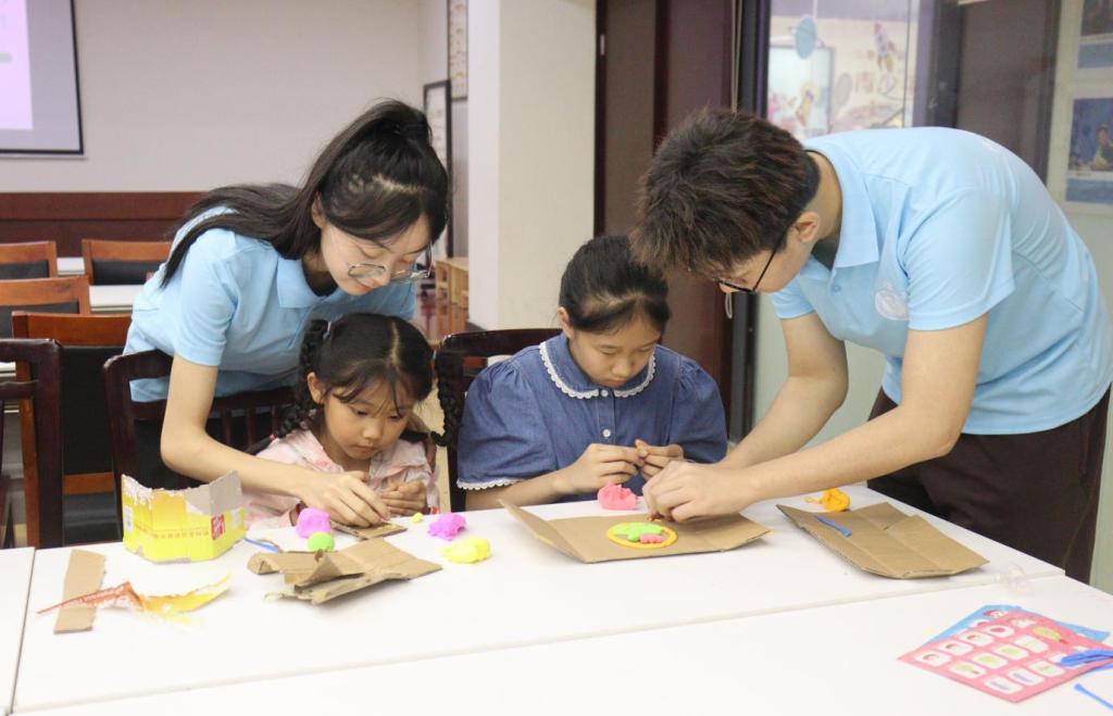 活动中,志愿者们带领社区的小朋友们,利用前一天在街边回收的纸板和水瓶,通过巧妙改造和创新设计,将这些废弃物变为充满童趣和创意的手工艺品。小朋友们与志愿者们组队合作,发挥想象力,将废品赋予了新的生命和价值,展现了“变废为宝,二次造物”的环保理念。