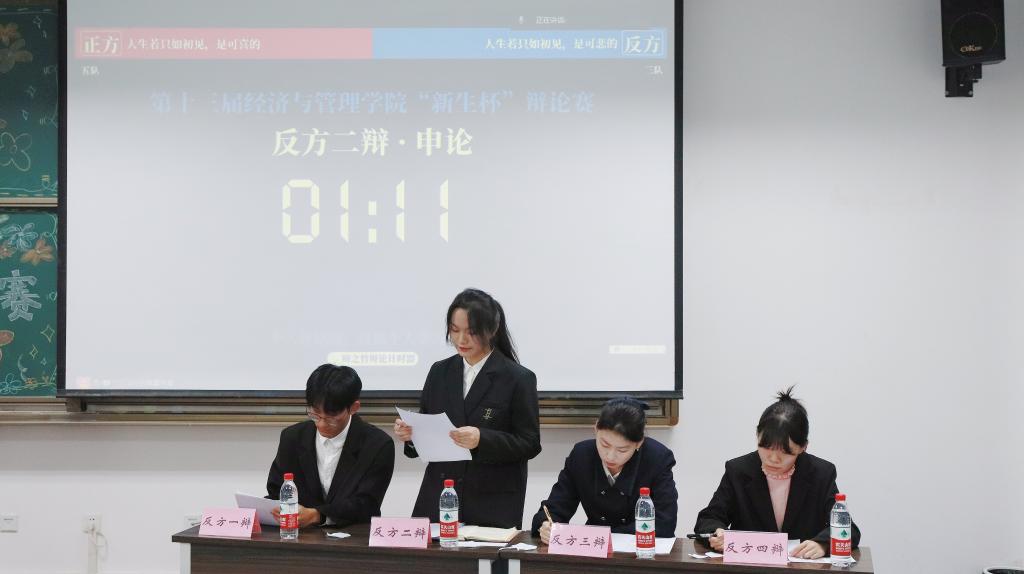 本场比赛以“人生若只如初见是可喜还是可悲”为辩题展开,比赛共有立论陈词、申论、对辩、盘问、自由辩论和结辩六个环节,辩论期间双方辩手娓娓道来,激烈交锋,严肃认真的同时幽默感十足,引得现场同学掌声连连,笑声不断。比赛现场精彩不停,热闹非凡。