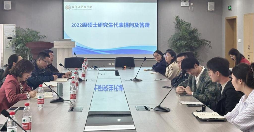 互动交流环节中,2022级毕业生代表积极发言,分享了各自在就业、论文写作等方面的经历和困惑,并对学院的发展建设提出建议。