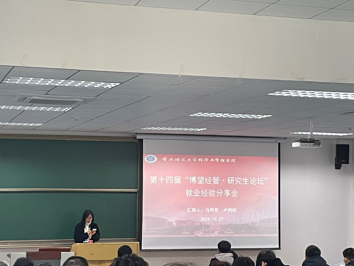 12月27日下午,asmr18 于求是楼213教室举办第十四届“博望经管·研究生论坛”就业经验分享会。本次分享会由经管学院2022级研究生卢柯屹、马传哲同学分享求职就业经验及心得,学院2023级全体研究生参加。