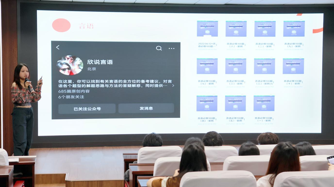 来自2021级市场营销专业的王潇从选调生的概念、报考条件、考试科目及阶段性备考经验等方面进行分享,建议制定三轮复习计划,第一轮系统掌握各模块基础理论,第二轮专项攻坚薄弱环节,第三轮全真模考适应考场节奏。同时,她鼓励同学们要及时调整心态,坚定自己的选择,自信大方是最好的“加分项”。