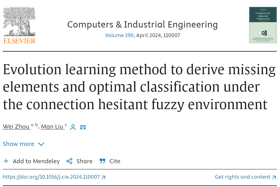 (3)发表于《Computers & Industrial Engineering》(SCI,中科院1区Top, IF: 7.9)的论文“Evolution learning method to derive missing elements and optimal classification under the connection hesitant fuzzy environment”,其中,柳曼为通讯作者,学院为通讯单位。