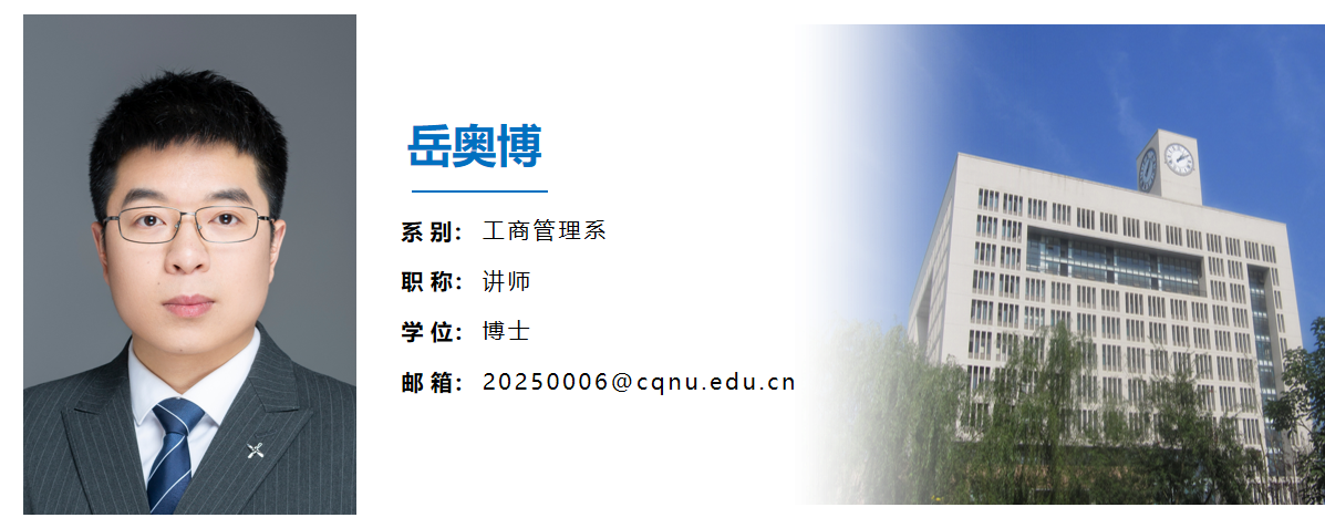 岳奥博,1994年9月,河南民权人,重庆大学管理科学与工程专业博士,讲师,中共党员。主要致力于城市大数据挖掘与公众行为分析、智慧城市建设与创新治理、城市关键基础设施韧性数智化治理等研究方向。以第一作者或通讯作者在Technological Forecasting & Social Change(IF=12.9)、Sustainable Cities and Society(IF=11.7)、Ecological Indicators(IF=7.0)和城市发展研究等高水平期刊发表论文15篇,其中SCI/SSCI/CSSCI 9篇。入选中国科协科技智库青年人才计划(2021年)。主持中国科协高端科技创新智库青年项目,参与国家社科基金项目、中央高校等省部级及以上项目10余项。担任Energy Efficiency、Ecological Indicators、Asia Pacific Journal of Marketing and Logistics、Plos one等多本SCI/SSCI期刊匿名审稿人。曾担任校研究生会主席,获得省优秀硕士学位论文等荣誉奖励。