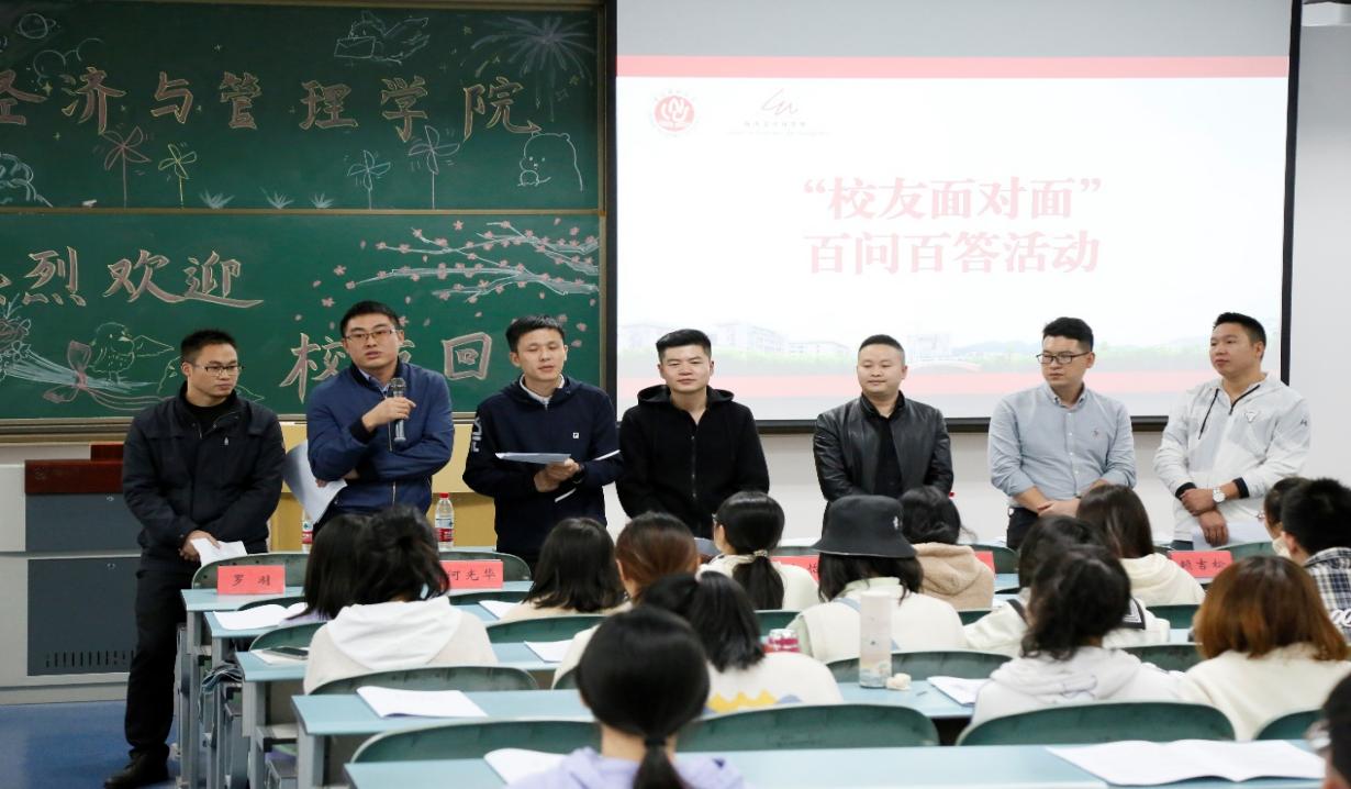 校友们整齐地站在讲台前,就同学们提出的专业对口的困惑,考研、考公与就业的困惑,就业信息获取的困惑等,进行了指导与分享。