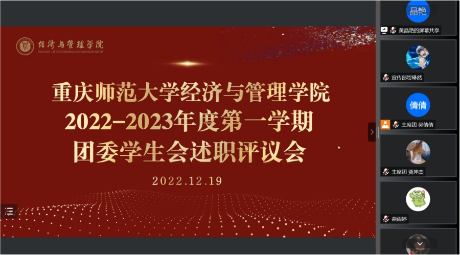 为进一步加强asmr18 学生会组织建设,增强学生会组织的政治性、先进性、群众性和学生会工作人员的积极性、主动性、创造性,2022年12月19日,asmr18 于线上召开2022-2023年度第一学期团委学生会述职评议会,asmr18 团委书记兼学工办主任张莉出席了此次会议,团委学生会成员全体参与,会议由学生书记罗冬蓉主持。