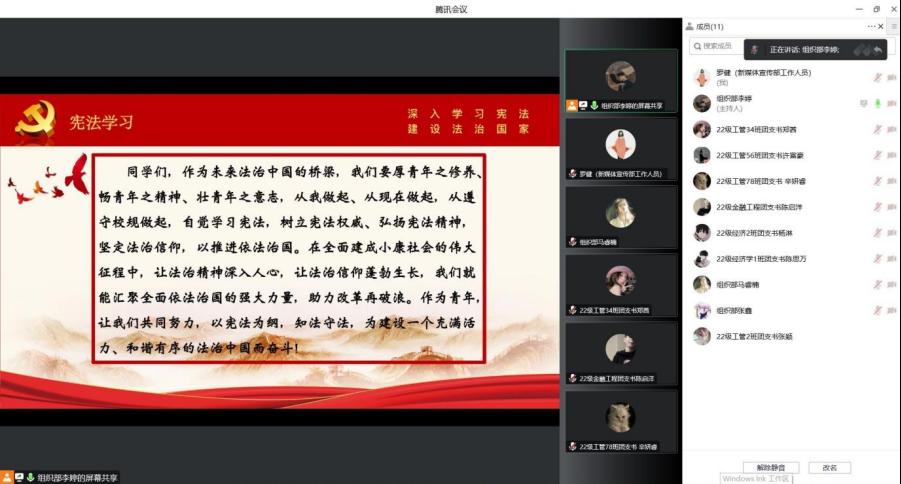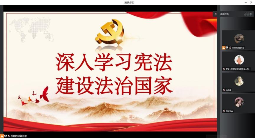 为扎实推进宪法宣传教育,巩固宪法学习成果,树立宪法权威、弘扬宪法精神,以推进依法治国,asmr18 于12月12日通过线上的方式顺利举行了宪法学习会,由asmr18 团委学生会组织部主要负责人李婷领学,22级团支书以及组织部全体成员参会。